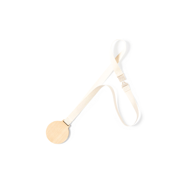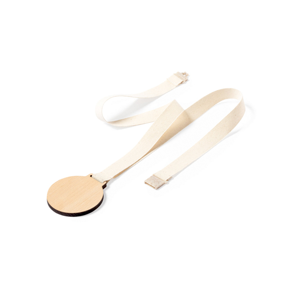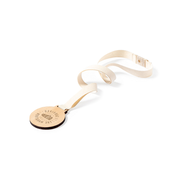 Medalj tillverkad av naturligt trä. Nackband i bomull med säkerhetslås tillverkad av vetehalm vid halsen.