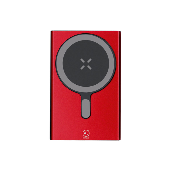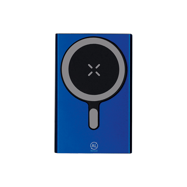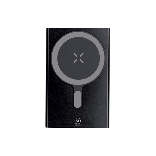 Powerbank tillverkad av återvunnet aluminium med USB Type C-ingång/utgång. LED-indikatorer för laddningsstatus, på/av-knapp och medföljande Type C-laddningskabel.
