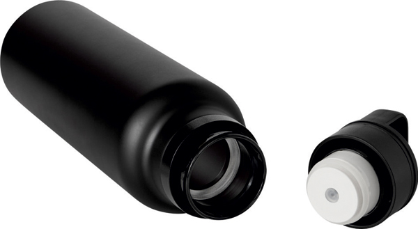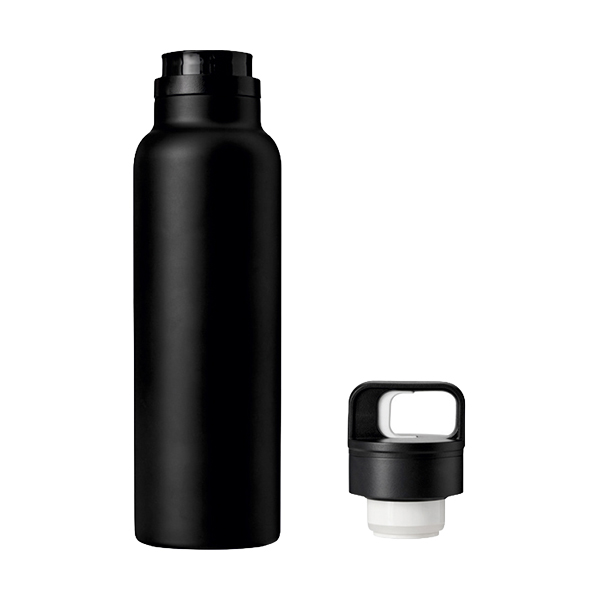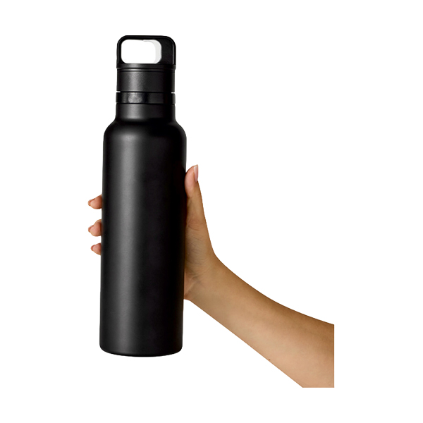 Flaska med dubbelvägg. Insida och utsida av rostfritt stål. Svart plastlock med klickstängning och bärhandtag. Håller varmt i ca 8 timmar och kallt i upp till 12 timmar.